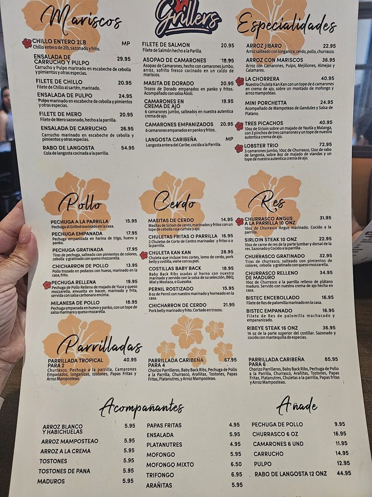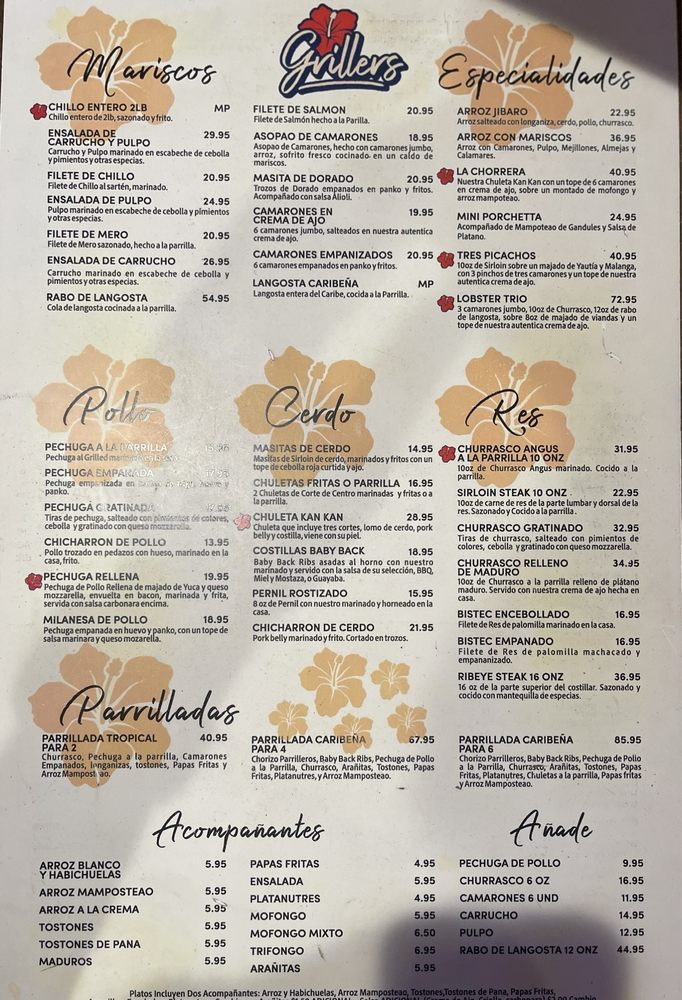 Introducing the menu at Grillers Puerto Rico located in Kissimmee, FL. This vibrant restaurant offers a variety of appetizers including Calamari, Corn Sticks, Fried Cheese, and more. The stuffed Mofongo options are a must-try, with choices like Chicken, Conch, Shrimp, and Steak Mofongo. Quesadillas, Wraps, and Salads are also available with protein options like Chicken and Steak. Customers rave about the flavorful dishes, lively atmosphere, and live music. The Pollo Rellena is a standout dish praised for its delicious flavors. Overall, Grillers Puerto Rico is a must-visit spot for those craving authentic Puerto Rican cuisine served with care and attention to detail.